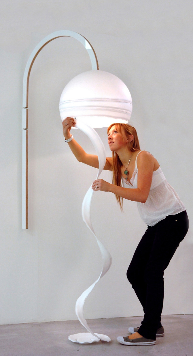 This sculptural indoor light requires the user to interact with it to alter the amount of light output. This design originates from my research into nature and plants and how they reveal inner layers of life and change according to the seasons. As the light unzips it spirals to the floor, pealing back the form and releasing the light. This is designed for an active environment where it can be visually stimulating as well as functional by Delmeza Hill