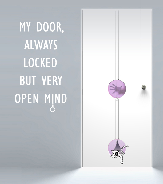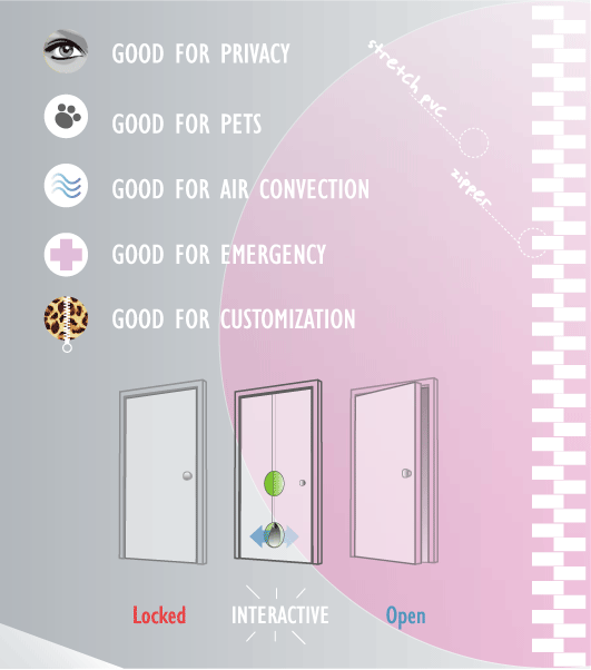 The idea of an interactive door ( do_or not disturb ) born looking at middle ages doors that had a hole for have a look before open it. The holes in my door are a possibility of interaction even if the door is locked. The zipper for privacy is only in one side, but it’s possible to have a double-face zipper for a bilateral interaction. With this door locked now many things as, a pet, a ringing gsm, the toilet paper, a kiss, the air… can pass through it. Also the light can pass through with the use of a translucent material creating an interesting light effect in the house. It is useful also for emergency if someone is locked inside it’s simple and safe to reach the key only cutting off the pvc layer by the italian David Artuffo.