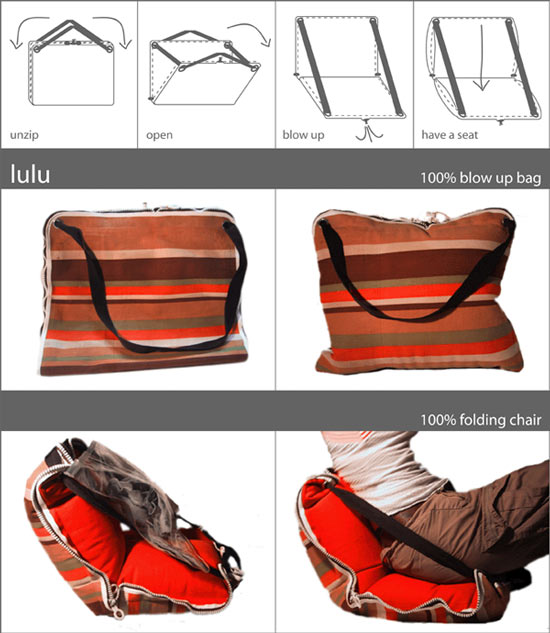 “Being a folding chair is just one of the options of my product. It is also a safe bag for fragile things (lap tops, bottles etc.) and a cosy pillow. It consists of a cloth covered inflatable part with 4 tin eyes , 2 zippers , and adjustable straps. Inside there is an extra bag made out of transparent plastic that can be folded to the side side with velcro straps. This allows using lulu as a bag and a seat without having to empty the contents when sitting down. It also protects the air chambers from sharp objects.” By Ann-Kristin Delfmann